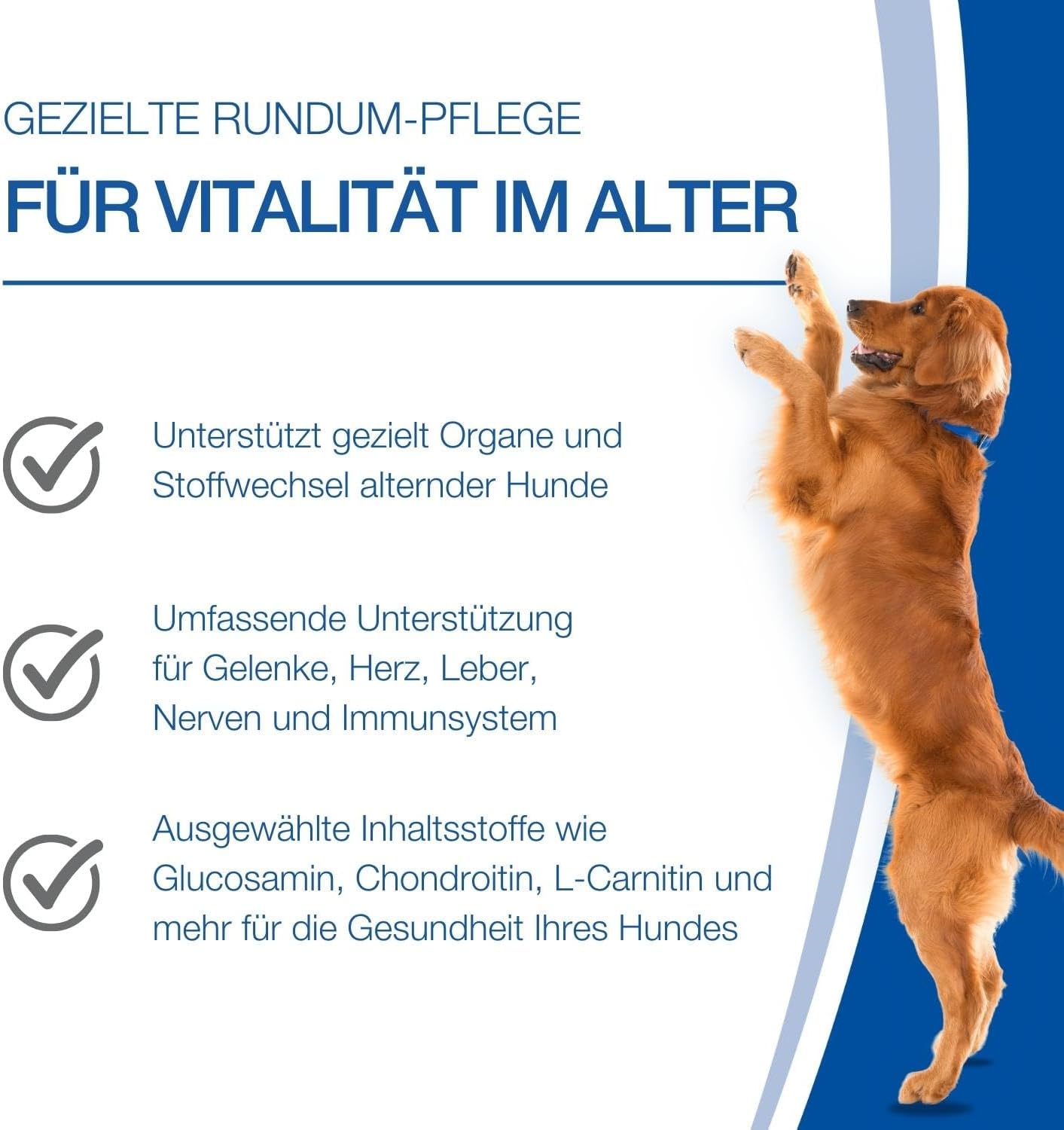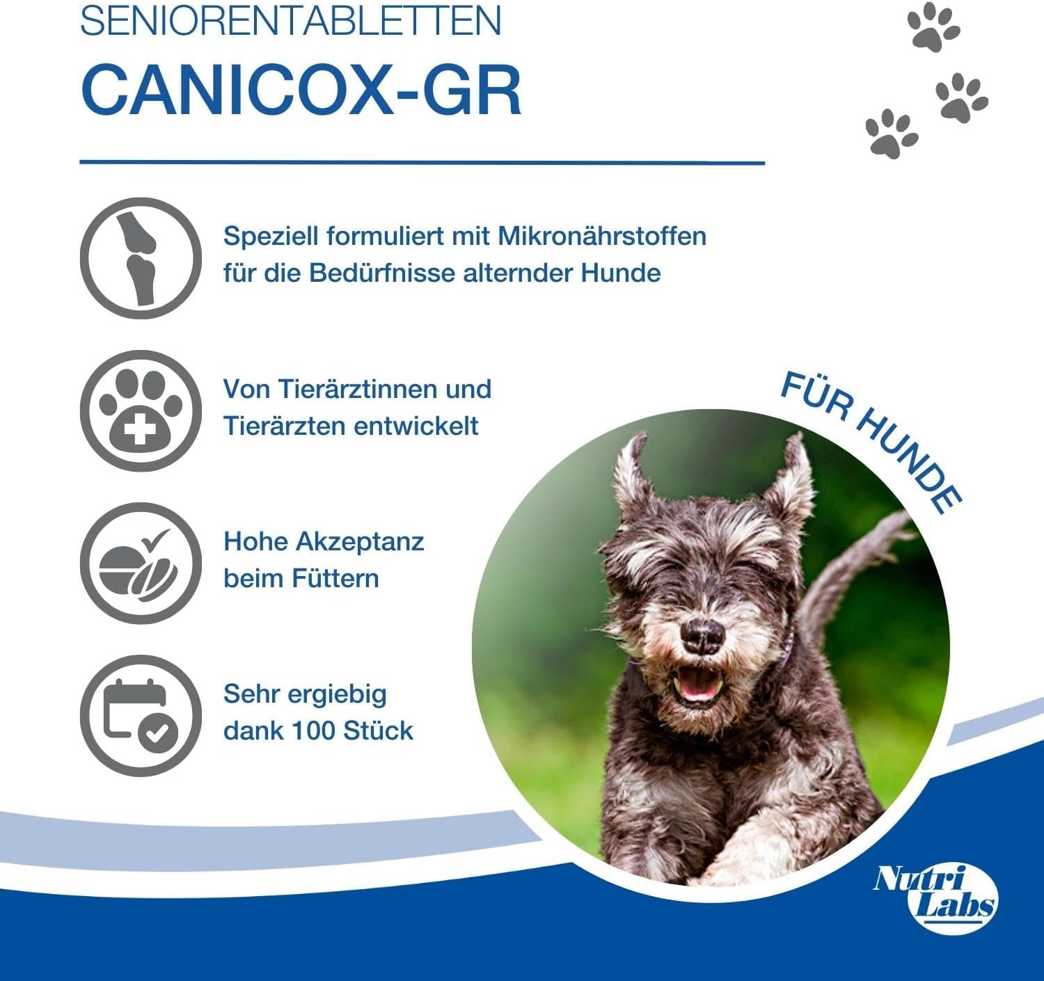 Canicox-GR Seniorentabletten vom Hersteller NutriLabs sind speziell für die Bedürfnisse älterer Hunde entwickelt. Die sorgfältig abgestimmte Rezeptur unterstützt Gelenke, Gehirn, Herz, Leber und Immunsystem – für ein aktives, vitales Leben im Alter.