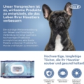 Die Tücher sind für den täglichen Gebrauch geeignet. Verwenden Sie die Tücher ein-bis zweimal täglich für 30 Sekunden gegen die Haarwuchsrichtung. Es ist nicht nötig, das Fell/die Haut danach abzuspülen.