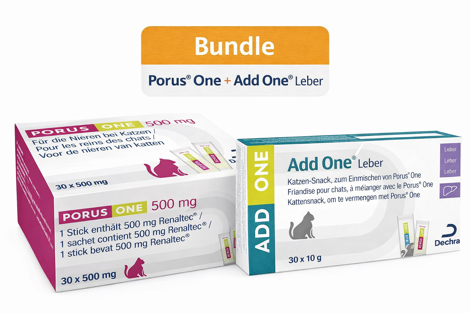 Die Kombination aus Porus® One und dem Add One® Katzensnack bietet eine besonders katzenfreundliche Lösung zur Unterstützung der Nierengesundheit. Während Porus® One gezielt im Darm wirkt und Vorstufen urämischer Toxine bindet, sorgt der cremige Add One® Leber-Snack für eine einfache, stressfreie und sichere Aufnahme – selbst bei wählerischen Katzen.